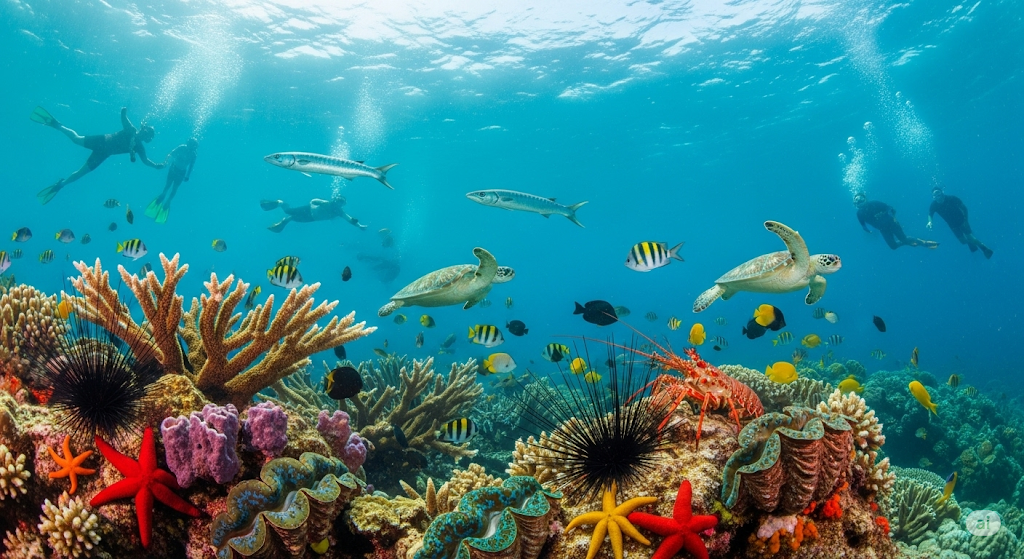 - Colorful Coral Reefs: Home to vibrant corals, sea fans, and marine plants.